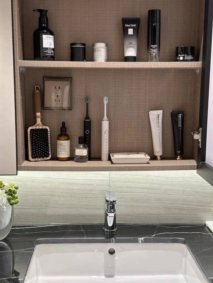 卫生间镜柜内部插座面板,让电动牙刷、冲牙器、电动剃须刀众多设备内置,保证美观度等等。