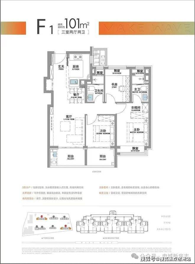 亮点设计:客厅阳台与北向书房窗户形成 “穿堂风”,夏季凉爽;厨房紧邻餐厅(餐客一体,视觉延伸感强),主卧飘窗可定制收纳柜,卫生间带镜柜收纳,满足三口之家储物需求;