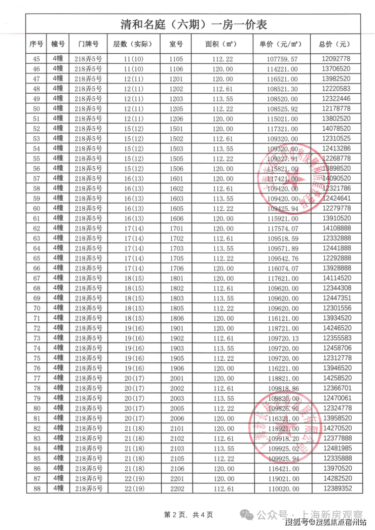 一房一价表如下