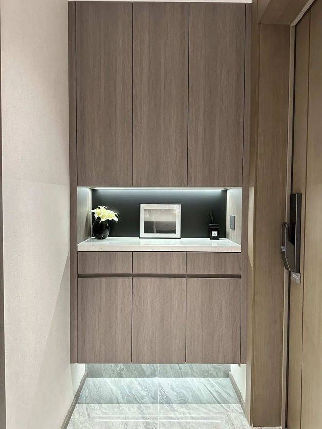 入户玄关更是设计了大量的收纳空间。底部架空,可以用来摆放鞋子,并设置有嵌入式灯带,整体的氛围感拉满。☑️☑️浦发上品售楼处电话:400 - 8377 - 020☑️☑️
