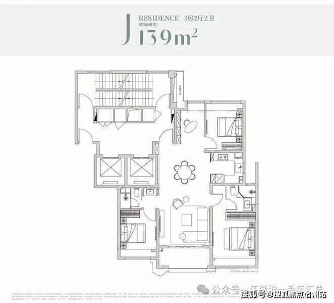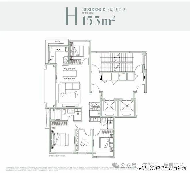 经典的四叶草布局,四开间分布在四角,兼顾私密与互动,是二胎家庭的优选。