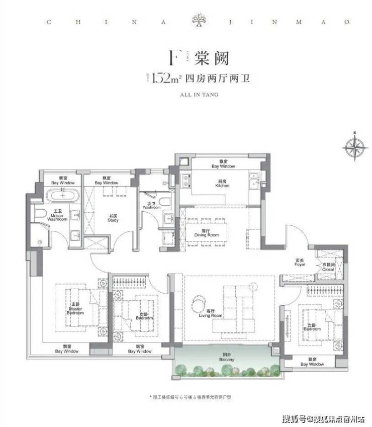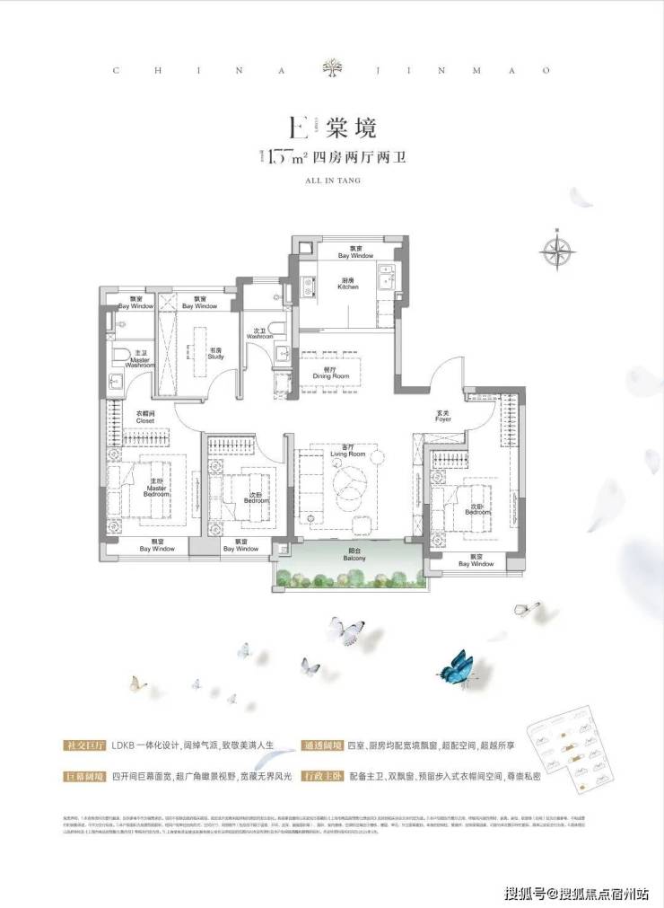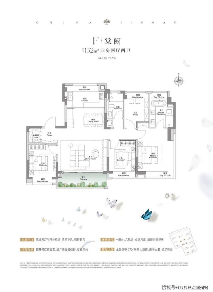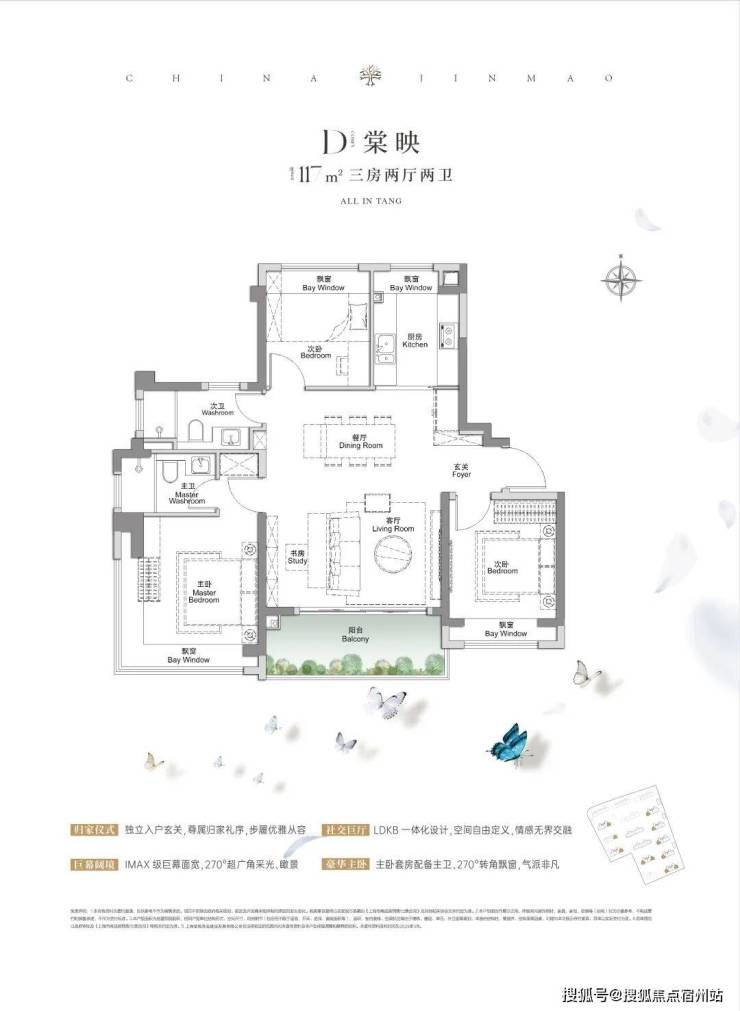 建面约117㎡3房2厅2卫 , 做到了 3+1开间朝南+5个飘窗+主卧套房设计+270°转角飘窗 , 所有的尺度都有进一步提升。