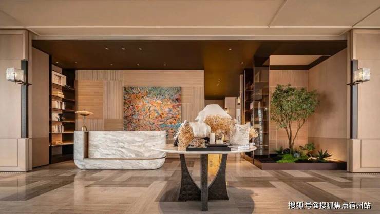 社区大堂极具仪式感, 未来会采用地下会所设计,入口采用三重弧形石材墙体+圆角幻彩穿孔顶,夜幕下如流淌的鎏金河流。