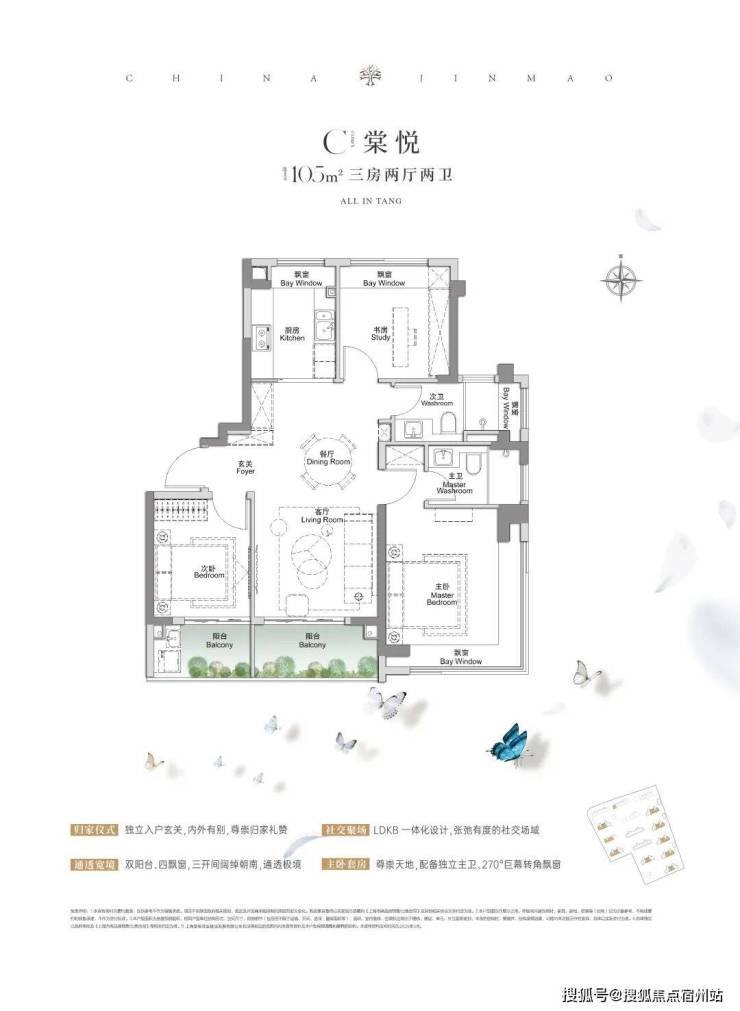 建面约105 ㎡3房2厅2卫,做到了 三开间朝南+4个飘窗+双面阳台系统+主卧套房设计+270°转角飘窗 , 该户型的居住体验、舒适度、尺度感,是同级别产品所无法比拟的。