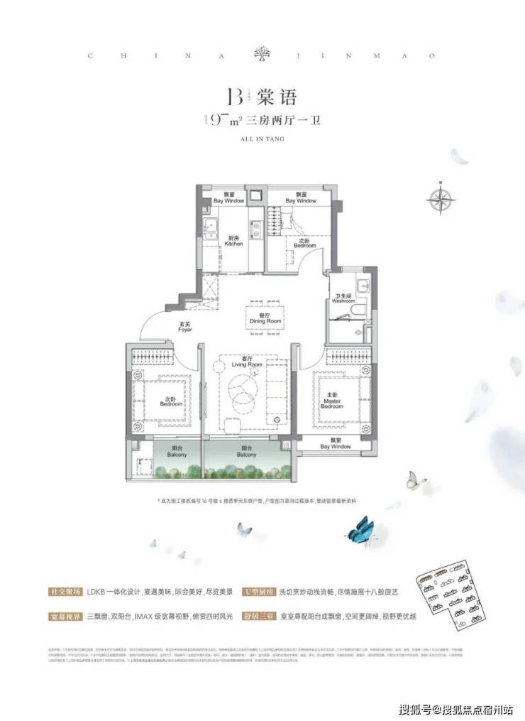 建面约97㎡3房2厅1卫, 户型 三开间朝南 、 再加上 “ 3个飘窗+双面阳台系统 ”, 不管是采光、视野、通风、私密性,还是实用性都十分出色。