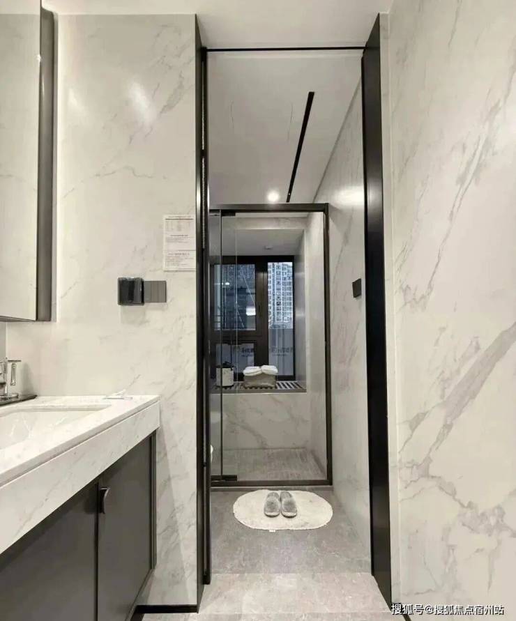 南次卧也是套间设计,而且也是明卫,设计上还是用了心思的。卧室部分净面宽约2.9m、进深约3.7m。根据测算,可以放置6尺的床(宽度约1.8m)+2个床头柜(宽度约45cm/个)+衣柜(深约60cm)是可以的。