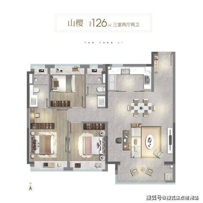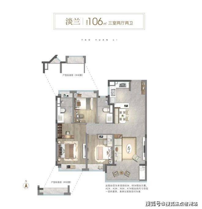 106㎡3房则做到“真三房”,不是市面的“2+1”,而是每个房间都能做卧室;约3.45米客厅面宽、开放式可视厨房、南向大阳台,让家庭公共活动空间更显开阔。