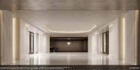 预接待厅地面瓷砖采用 威尼斯白爵士白石材拼花 设 计,纯人工铺装保证花纹的奢华质感。