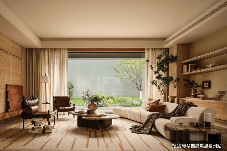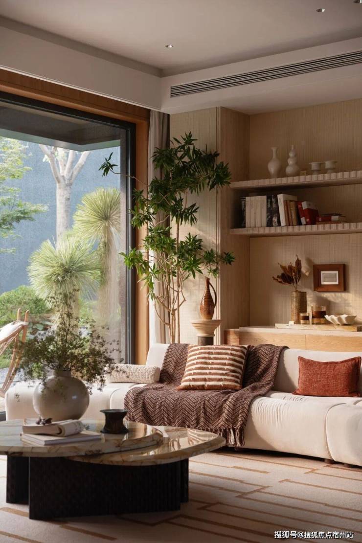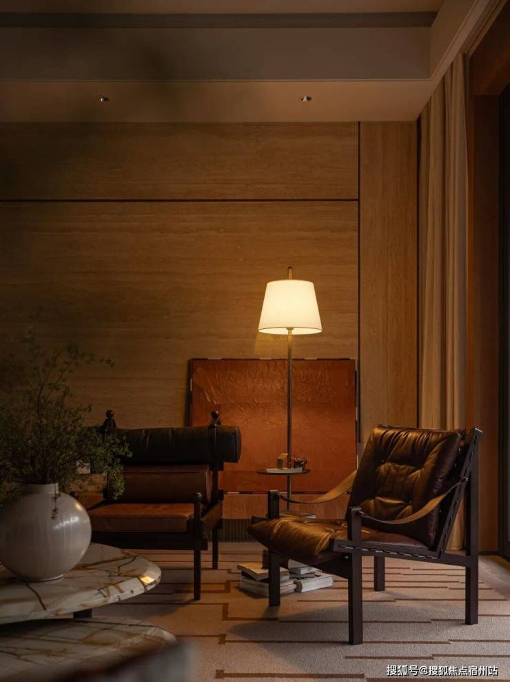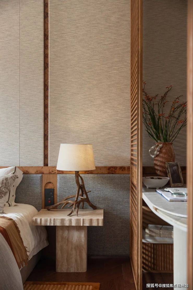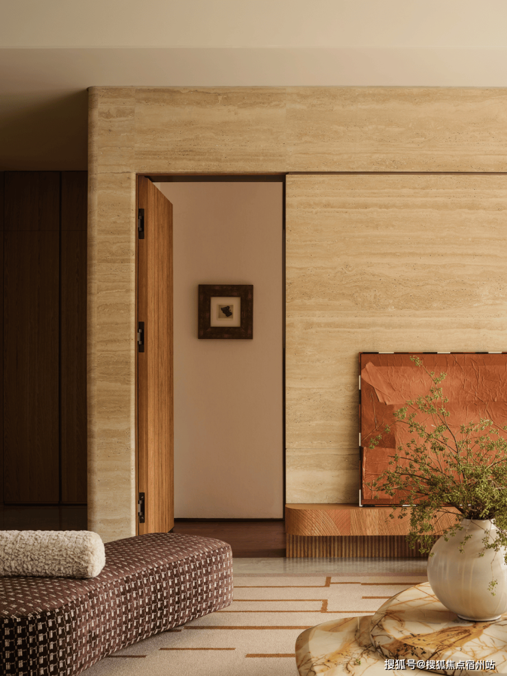 自然洞石的天然纹理与绿植形成"自然性"表达,呼应度假场景中"都市度假"诉求;阳光透过窗帘洒入柔和光影,与墙面共同营造疗愈性光环境。