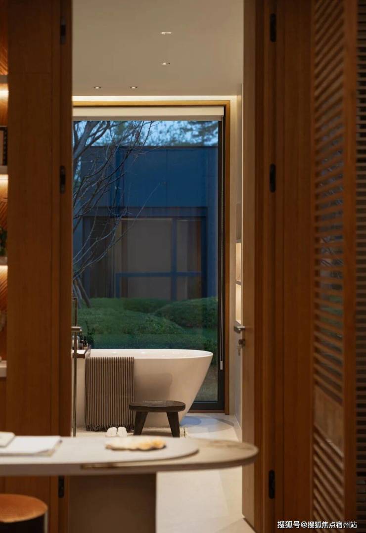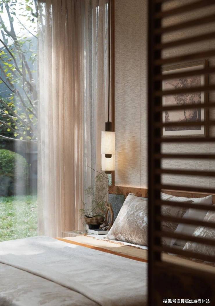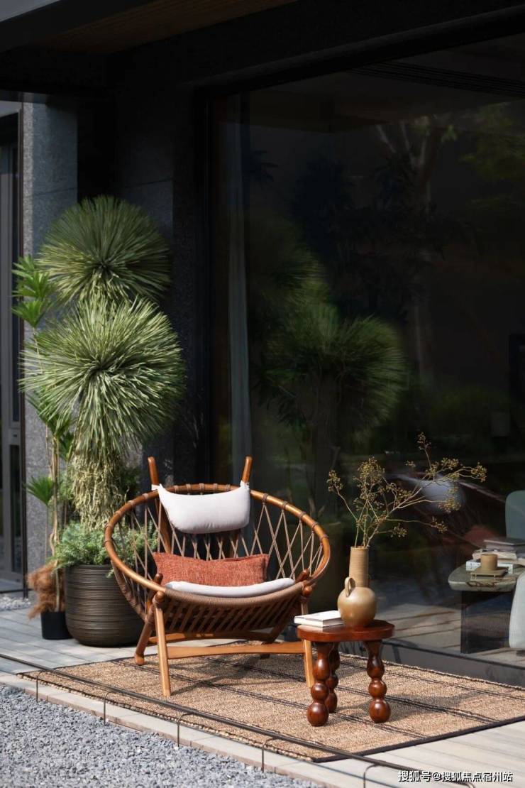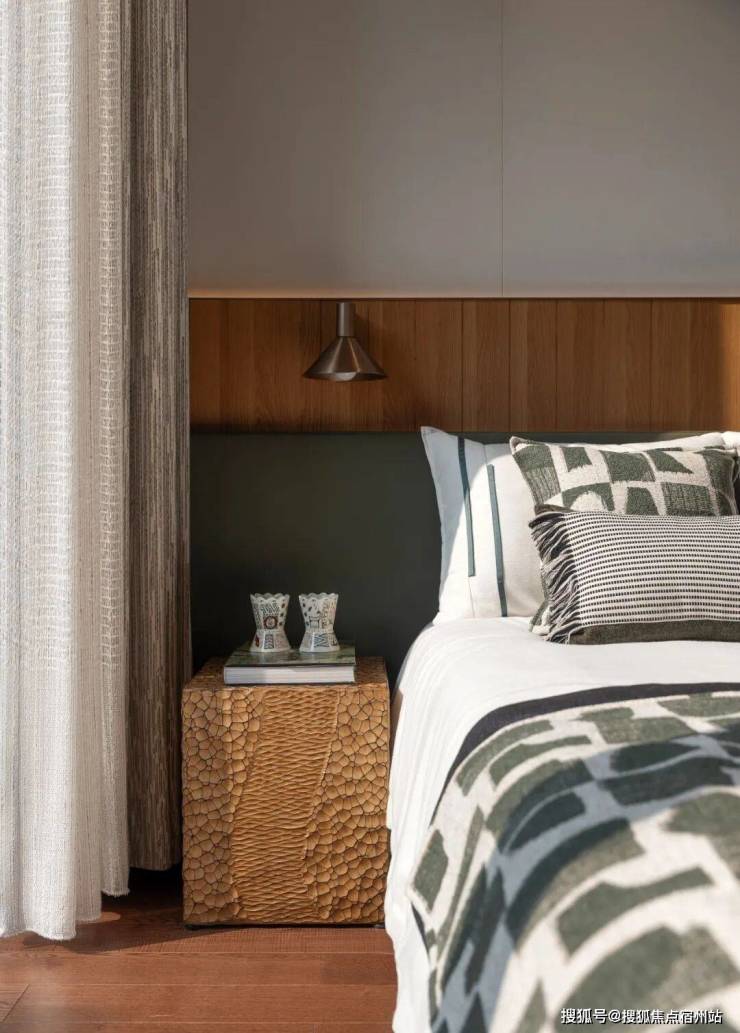 自然洞石的天然纹理与绿植形成"自然性"表达,呼应度假场景中"都市度假"诉求;阳光透过窗帘洒入柔和光影,与墙面共同营造疗愈性光环境。