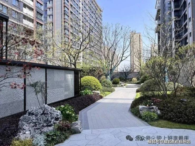 一条清韵石径,挑选造型独特的石头、三两组合成景,搭配特选的造型植物,极具艺术美感。而清泉石流景墙背后,就是未来业主的生活区。