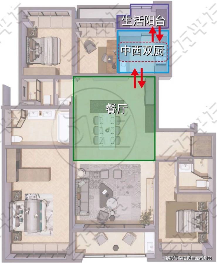 中厨衔接生活阳台,操作便利实用至上;西厨与餐厅有机联动,自然成就社交中心。优化餐厨动线,让烹饪与欢聚同时进行,成就您的生活主场。