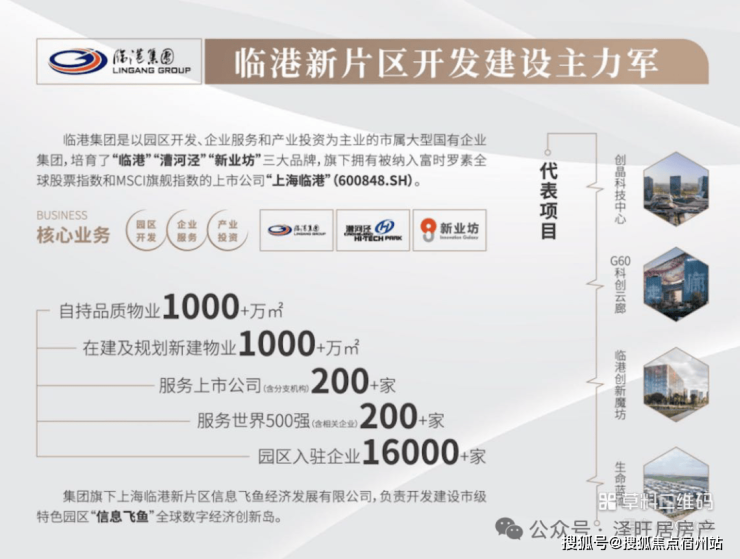 目前临港集团自持物业超过1000+万㎡、服务上市机构超超过200多家、服务世界500强企业超过200家、园区入驻企业超过16000家,同 时在全市范围内拥有14个市级特色产业园区,占全市总量的1/4 。旗下拥有包括像“G60科创云廊、漕河泾新兴技术园、临港科技城”等多个全市知名产业园区园区。