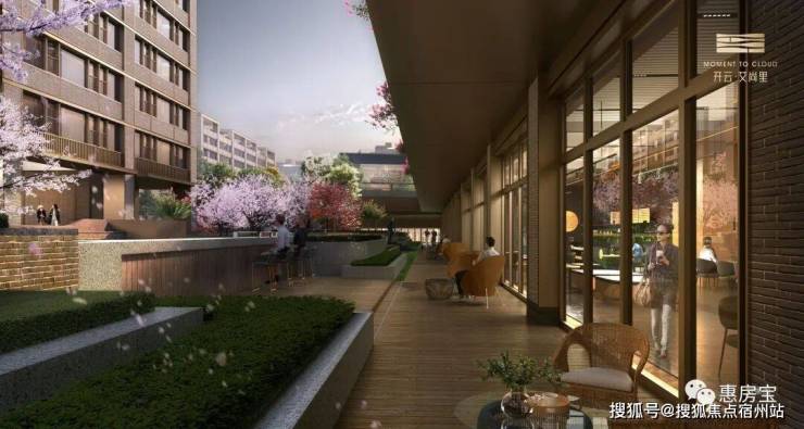 融合式架空庭院,通过借景的手法,将住宅与樱花谷景观相衔接,增加邻里互动空间,重现海派里弄的温馨场景。