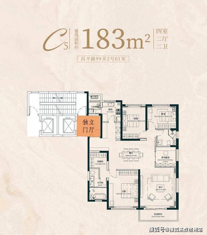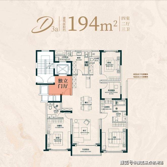 该户型的亮点是双套房的配置。而且你仔细看,2个套房分列客厅左右,并且配置极为相似。这样两代人不仅保持了各自独立性和私密性,在舒适度上也接近。
