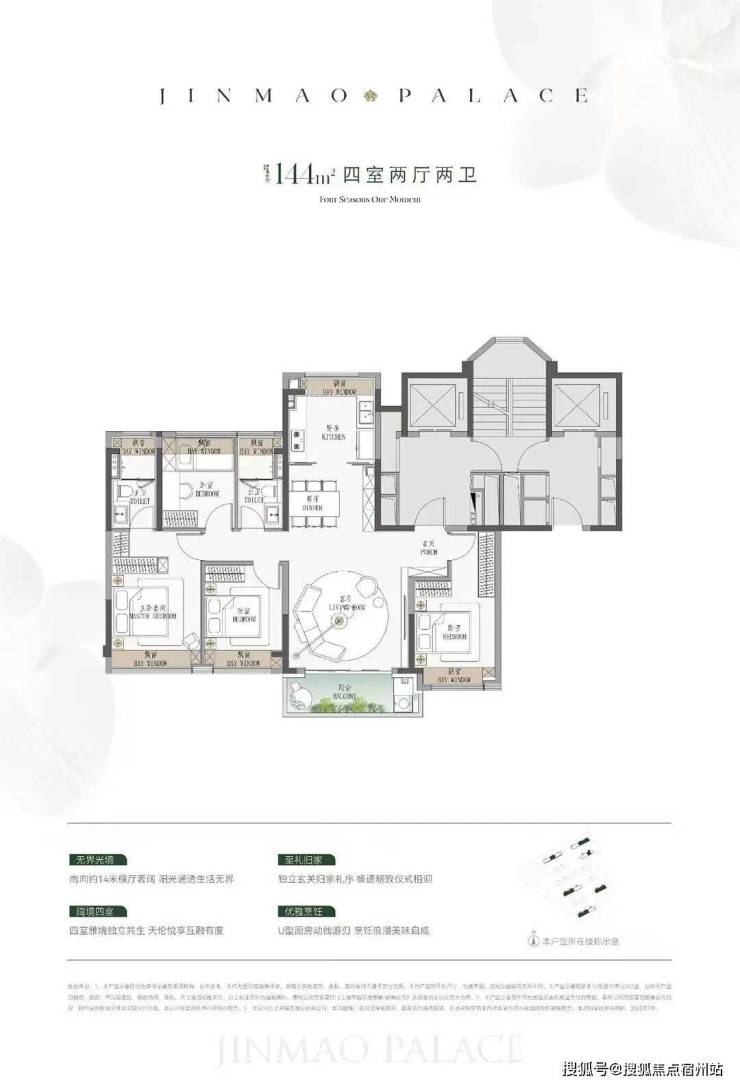 约144平4房2卫2厅户型,南向面宽超过14米,房间尺度感更强,比较适合高端改善家庭。