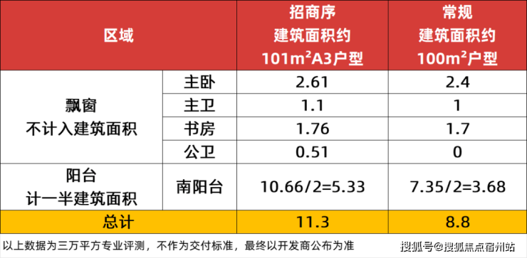 通过专业测评还可以看出 招商序的不计入建筑面积的部分有整整11.3㎡,相当于多出一个房间,针对百平三房这样的紧凑型户型来说,性价比真的很高,实际居住体验也会更舒适!