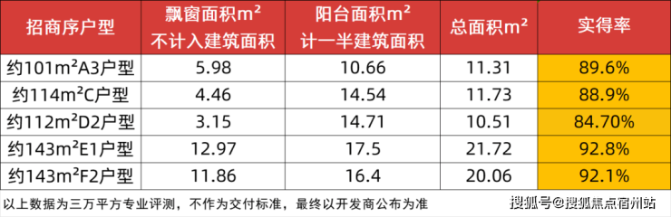 市面上常规高层的百平三房,我们按常规约75%得房率来计算,在计入飘窗和一半阳台的情况下,实得率,也很难突破85%!