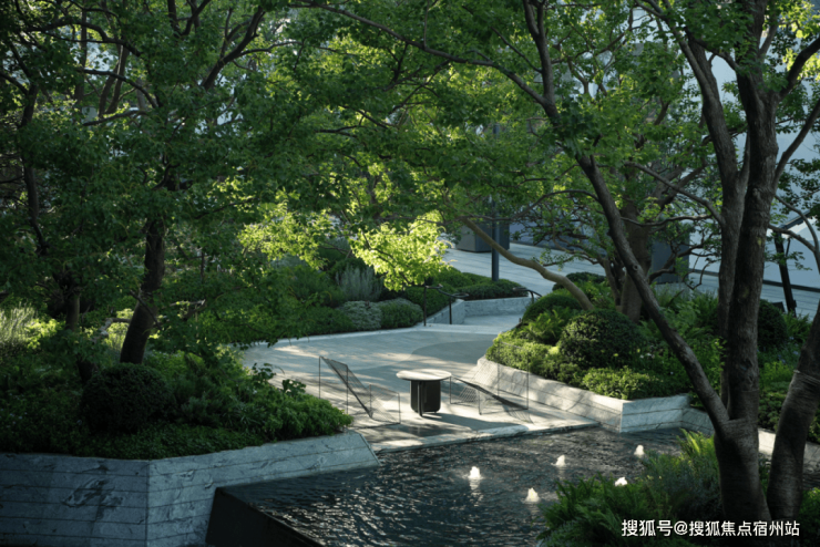花池与水台的交界近景,借由地形高差,让水景与绿植形成丰富层次,以现代手法将自然意趣浓缩于一方天地,两种质感、深浅的体块嵌合之美,涌泉隐没在体块间,在日常风景里增加一点诗意的氛围。