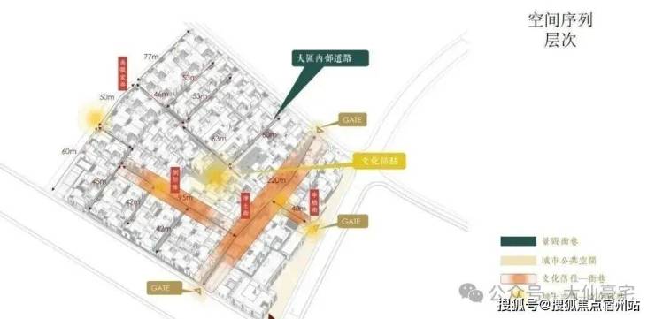 士林润园别墅规划可分为蓬莱路城市公共景观以及社区内部景观两个部分,其中市政绿地衔接于上海2035城市总体规划中“蓝绿丝带”的上位条件要求,社区内部街巷空间形成空间序列形成递进的层次,将归家体验的序列依次展开,形成城市街道→入口(一级门户)→街巷→节点空间→里弄门(二级门户)→合院入户(三级门户)的方式,基本可保证大多数住户可体验到两重以上的空间递进。