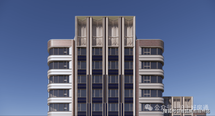 住宅立面颜色 以珍珠蓝为核心,搭配香槟金、海派红,两侧还采用弧形设计, 比方正的建筑看起来更柔和,也让视野更大化,实现约270°观景。
