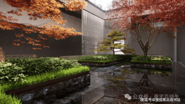 项目利用下沉式景观庭院,结合艺术花园、摩登水景等,打造了一座建面约1200㎡的高端下沉式会所,规划设有泳池、健身房、行政酒廊等场景。