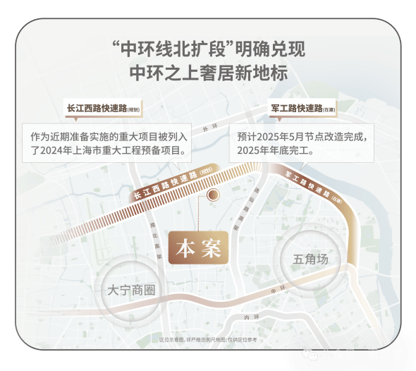 中环线北扩段明确兑现,军工路快速路25年开工,长江西路快速路列入上海市重大工程清单预备项目,快速链通城心, 随着中环线北扩段的政策明确,淞南将正式进入中环时间。未来经逸仙高架,进入南北高架、内环高架、中环高架,可快速链通南北上海;多维立体路网全面升级,未来区域价值再攀新高。