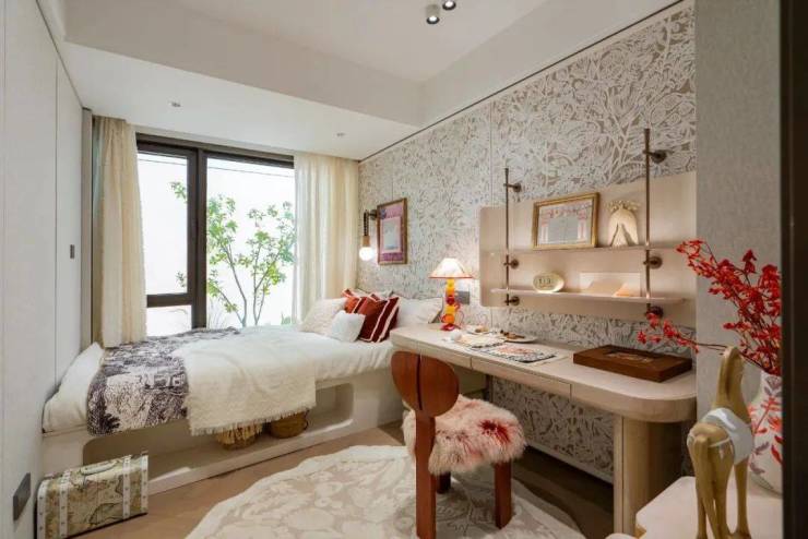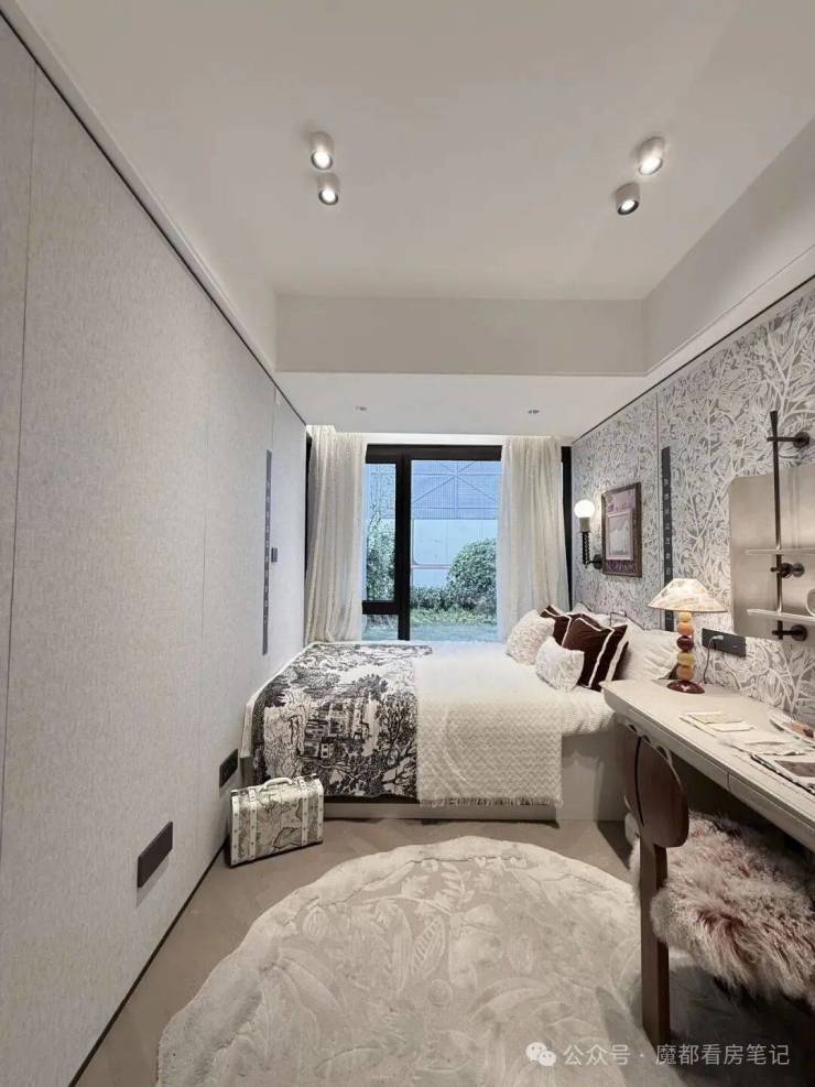 首先,这是北次卧,不仅能放下一张完整的床,还能放下一张大尺寸的办公桌或者是梳妆台,甚至还有空间做一些收纳柜和床头柜等。这样的尺度感和实用性,真的比一般建面约120㎡以上的宽绰3房更加惊人。