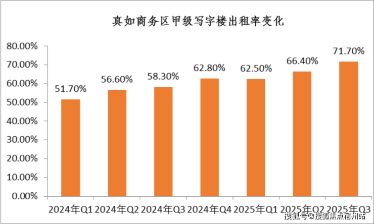 真如的产业规模十分扎实。公开数据显示,2024年,中海中心跃居上海写字楼年度租赁市场成交榜首。真如商务区甲级写字楼出租率也一路攀升——从2024年一季度的51.7%,提升至2025年三季度的71.7%。
