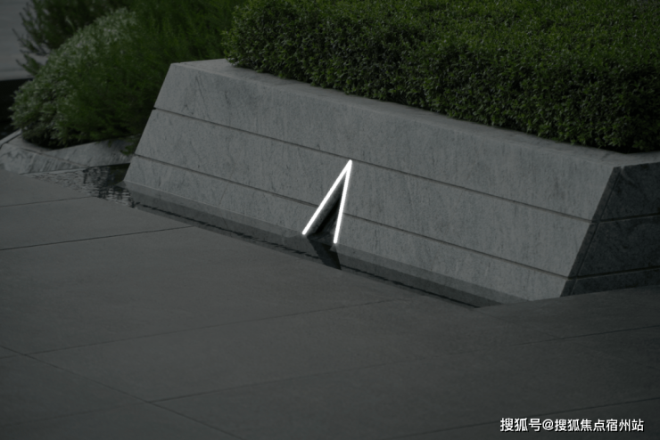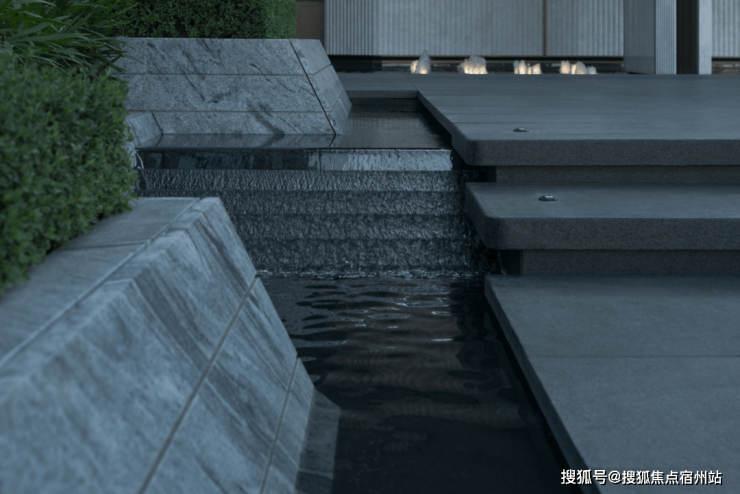 花池与水台的交界近景,借由地形高差,让水景与绿植形成丰富层次,以现代手法将自然意趣浓缩于一方天地,两种质感、深浅的体块嵌合之美,涌泉隐没在体块间,在日常风景里增加一点诗意的氛围。
