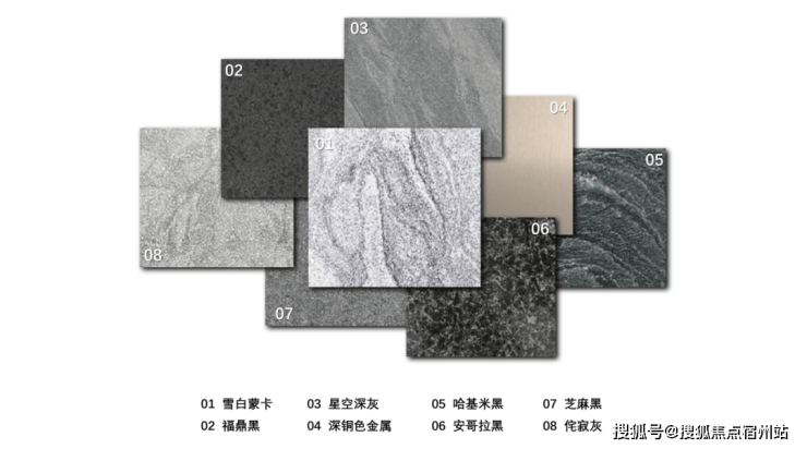 材料色彩上选用“雅黑+奢金+写意白”为核心色彩基调,通过色彩的层次搭配与材质的细腻融合,构建简约而奢华的空间调性。以雪白蒙卡作为主要立面材料,铺陈开阔通透的视觉基底,凸显空间的雅致格调;雅黑色系的铺装强化空间的沉稳气质;奢金则作为点睛之笔,与底色碰撞出精致华贵的质感。