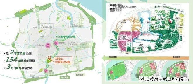 约200万方世博文化公园+前滩百万方公园群+三林绿地,共构成约700万方滨江公园,成就滨江双S湾最大的百万方公园群。