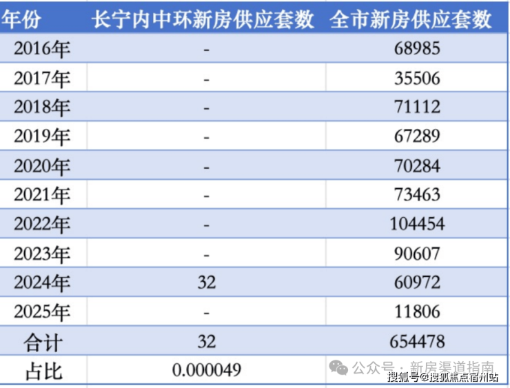 近10年(2016年至今)全上海合计入市新房65万多套,其中属于长宁内中环的只有32套,占比仅约0.000049!不到10万分之五的机会,臻稀程度简直爆表!