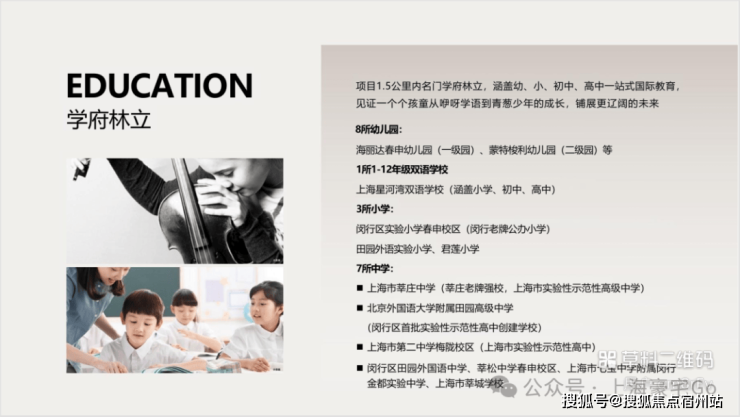 教育:上海私立蒙特梭利幼儿园、上海闵行实验小学、上海星河湾双语学校、上海市田园高级中学等,一站式全学龄学府林立。
