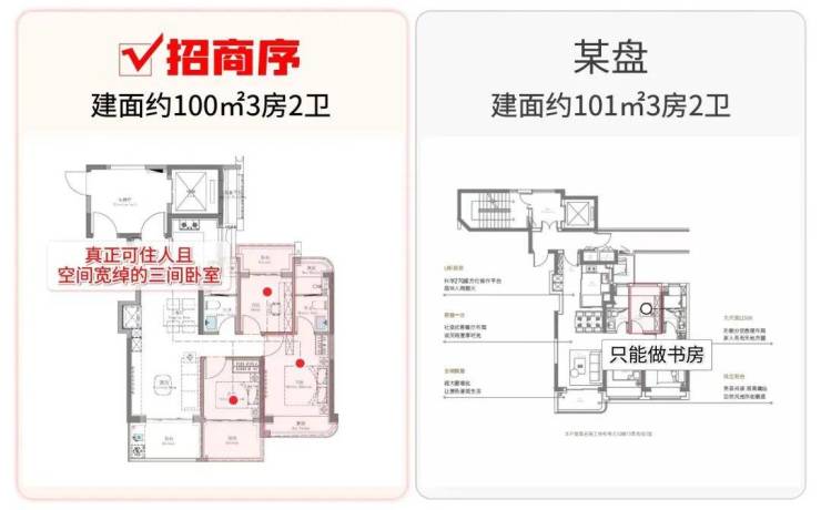 这是百平米3房那么多年一直无法解决的通病,但招商序的百平米3房却截然不同,TA凭借着3阳台的设计,给到客户一个真正的三房户型: