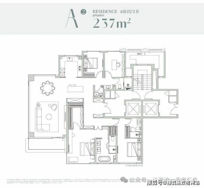 经典的四叶草布局,四开间分布在四角,兼顾私密与互动,是二胎家庭的优选。