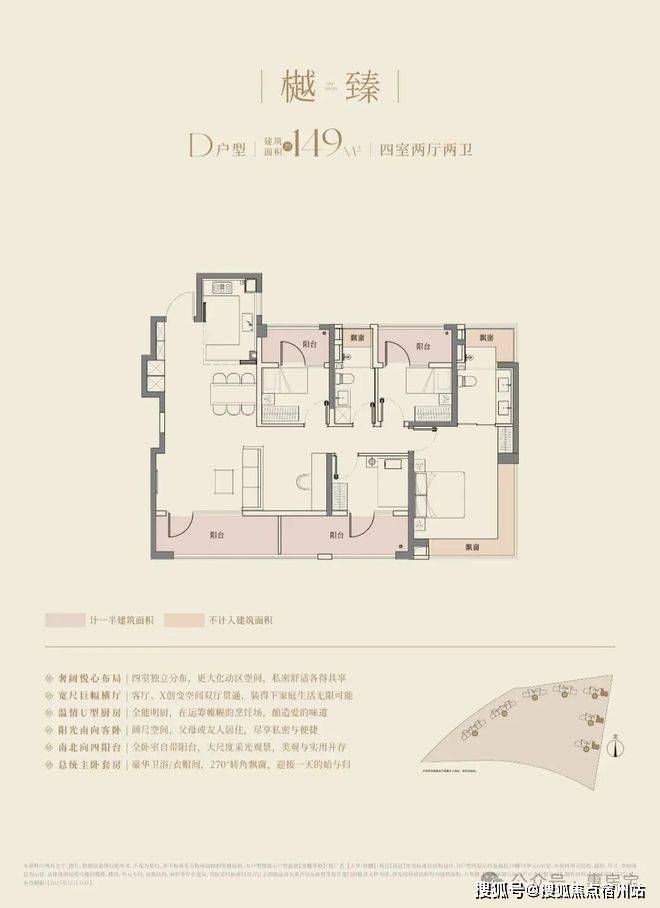 经典动静分离户型,4.5开间朝南+南北四阳台,阳合仅计算一半建筑面积,主卧以及主卫附赠270°转角飘窗;✔✔大华·望樾售楼处电话☎:400-833-6309【欢迎预约】