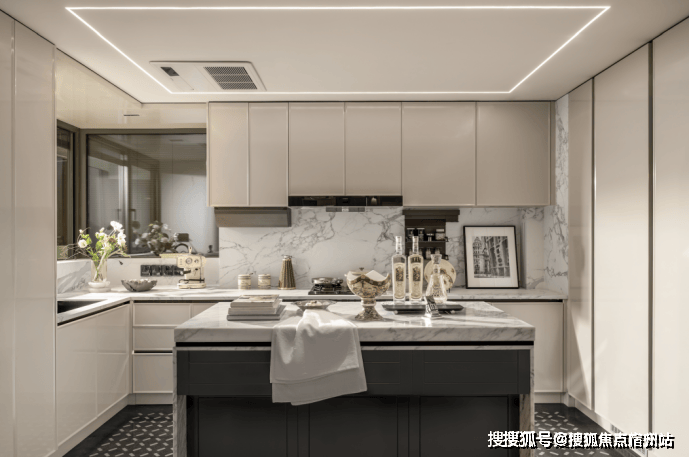 超大尺度的中西岛台,既符合中式烹饪的实用逻辑(预留足够操作台面),又能承载西式社交(朋友小聚时在岛台品酒聊天),让厨房从“单一做饭空间”变成“生活场景发生器”。