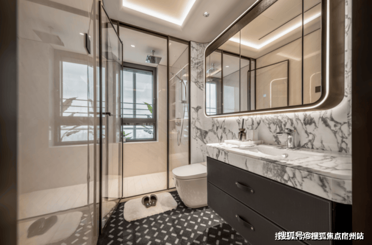 大理石地砖的铺装工艺精湛,近乎看不出拼接缝,呈现出浑然一体的效果;吊顶采用悬浮顶设计,周边用金属包边,层次感十足;卫生间墙面不乏弧形处理,地板纹路的拼法也各有不同,通过复杂的工艺,只为呈现更优的视觉效果。