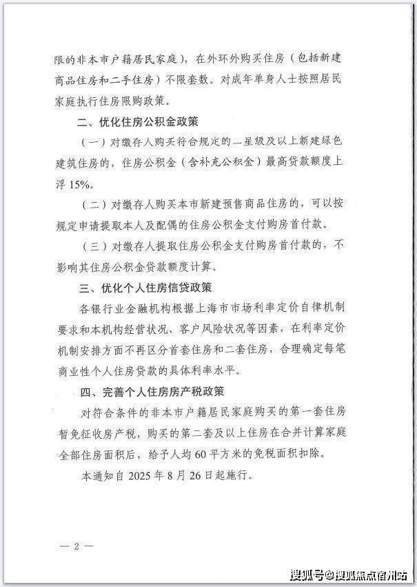 为更好满足居民刚性住房需求和多样化改善性住房需求,促进房地产市场平稳健康发展,8月25日,市住房城乡建设管理委、市房屋管理局、市财政局、市税务局、人民银行上海市分行、市公积金管理中心等六部门联合印发《关于优化调整本市房地产政策措施的通知》(以下简称《通知》),包括调减住房限购、优化住房公积金、优化个人住房信贷以及完善个人住房房产税等政策。《通知》自2025年8月26日起施行。