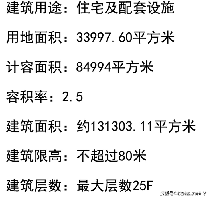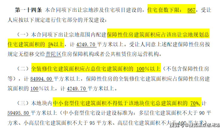 地块用地性质为普通商品房,容积率约2.5,限高80米,住宅套数下限867套,需配建5%以上保障性住房,中小套户型不得低于70%,全装修比例100%!