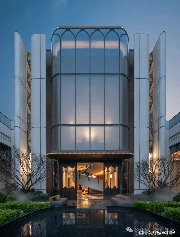 现代艺术与曲面质感的和鸣,建筑顶部沿用贵雅技法定制,考究流体力学,为徐汇滨江营造新城市流体建筑封面。