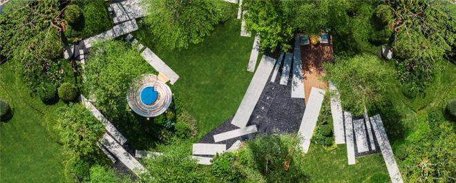 聆星客厅前方种植了松界王者—— 日本黑松,约4000万+的顶豪融创外滩壹号院的社区内,也有一颗同款;