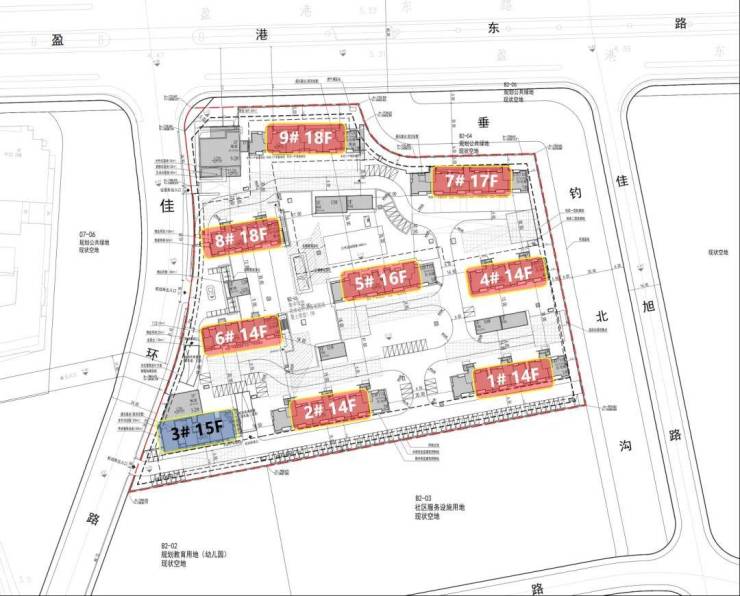 非人车分流,部分楼栋首层有架空,东面有河道经过,南面规划了一处幼儿园用地。