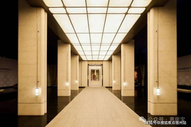 通过迎宾楼,便来到了 约20米长的精神游廊 , 该精神游廊同源招商玺 “树宅相守”的设计手法,更致敬建筑诗人斯卡帕“以自然光感去创造时间驻留感”的理念 ,通过对光线、材质与空间的创新打造,营造充满宁静的归家场域。