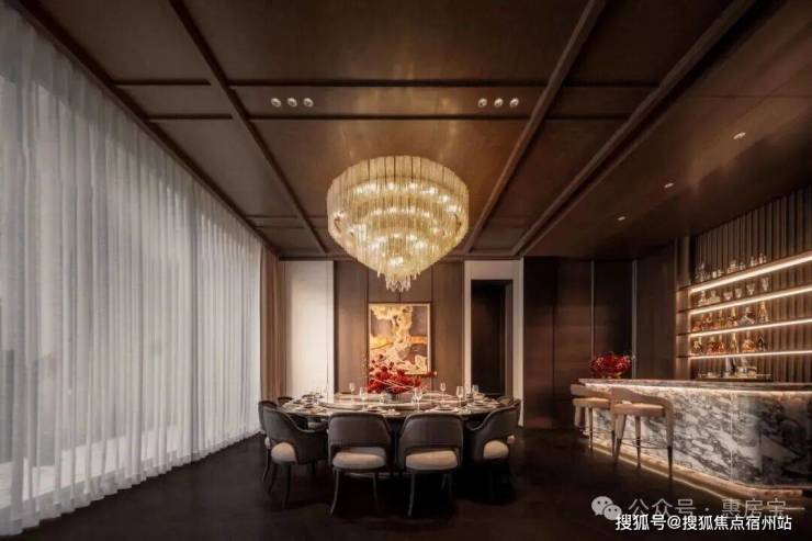 而业主专享的私宴厅则是将 “尊贵感”说到了极致! 臻选奢石营造雅致屏风,墙上大师匠呈繁花艺作,定制灯具璀璨生辉,摩登意蕴充盈其中,匹配大人物品位。除了敞阔的就餐空间,还独立配置吧台、品茗休息区。暮色四合,华灯初上,谈笑风生中展现风雅从容,觥筹交错间皆是繁华丰茂。