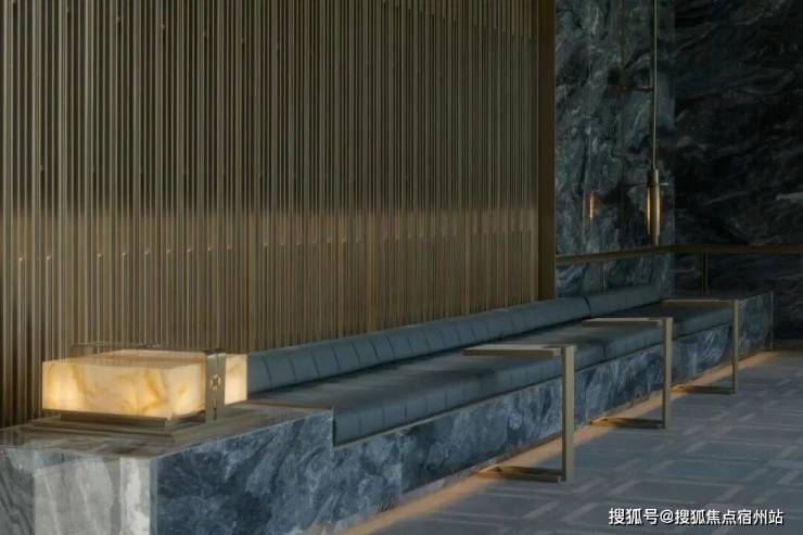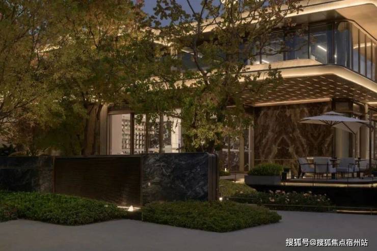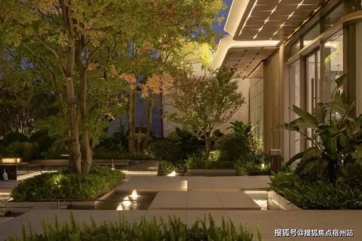 入口两边采用实体景墙与格栅形式,形成围合式院落空间,景墙前端采用奢石与金属点缀,墙面使用照壁灯有序排列,尽显奢侈度假风范。两侧阵列植物绿化,营造迎宾仪式感,凸显品质与调性。 院落内部设计采用了酒店式下落客的设计手法,中心圆形水盘聚八方之财气,寓意财源风水。圆盘水景中间选用特选造型树点缀,营造浓郁的度假氛围。配备豪华酒店式落客区的大堂设计,实现业主尊贵的归家仪式。