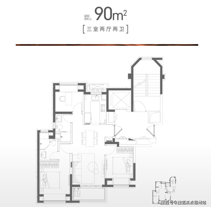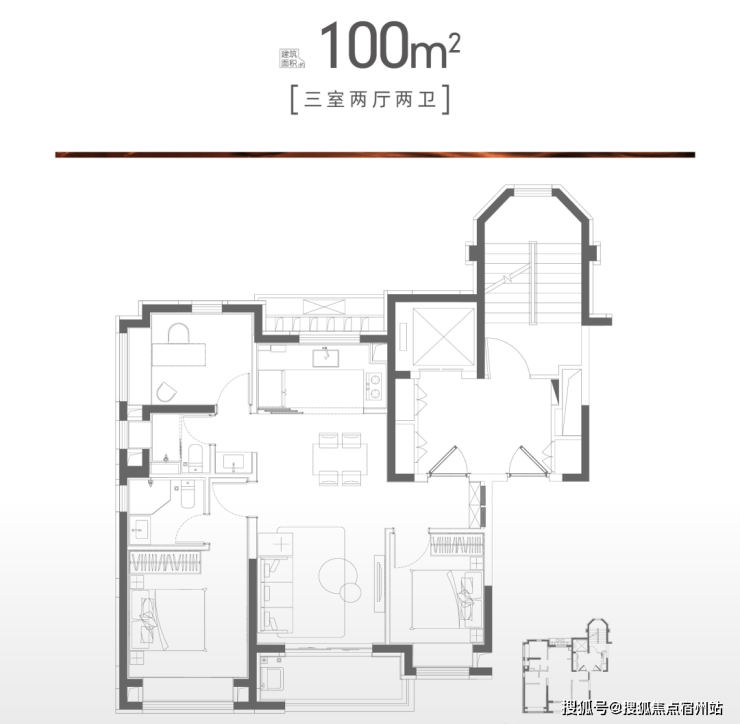 建面约100㎡户型设计得恰到好处!整个户型格局方正,也是当下颇受欢迎的飞机户型。三开间朝南+餐客厨阳台一体化+双卫设计,同时无过道浪费,加上高标准的精装交付标准,真正实现交付后拎包入住。