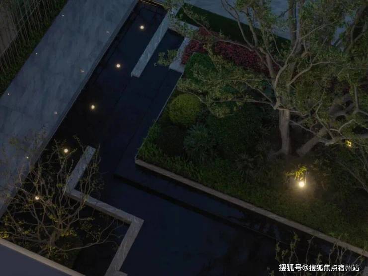 通过建筑门头来到礼仪归家水轴线。层级叠水与叠水景墙结合,再搭配阵列的乔木与草坪灯,形成尊贵归家礼仪感,强调轻奢度假感,始终贯彻现代轻奢度假的设计理念。点缀的涌泉与植物相映成趣,希望每一位业主都能在归家之前恢复平静的心情。通过涌泉、叠瀑、镜面水等多种景观形态,让业主能够感受到人与自然和谐共生。