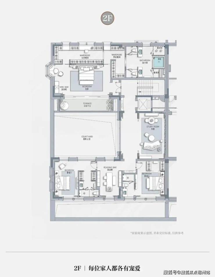 一层长辈套房设计,南向独立小庭院,莳花弄草,晨练太极自在四季